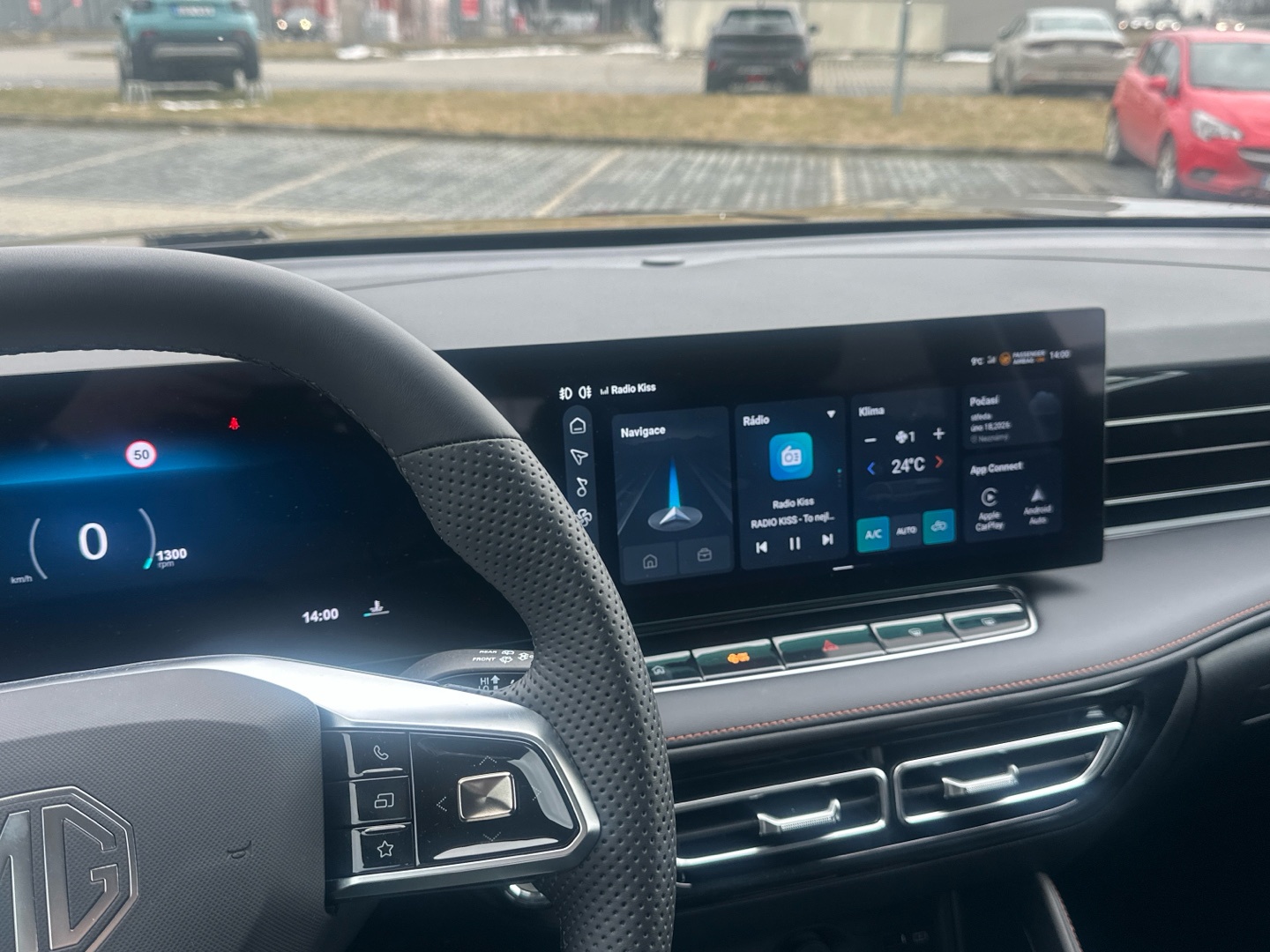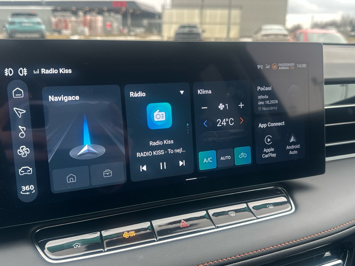 - Autorádio s dotykovým displejem 12″ s USB, DAB a Bluetooth HandsFree, zrcadlení telefonu (Apple CarPlay, Android Auto)