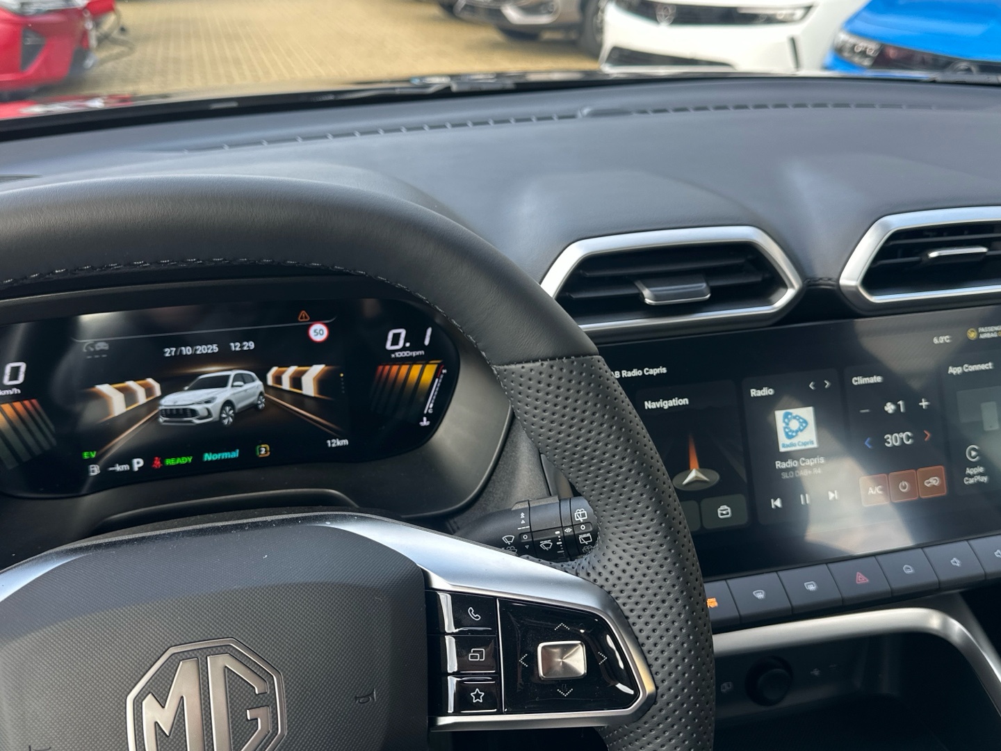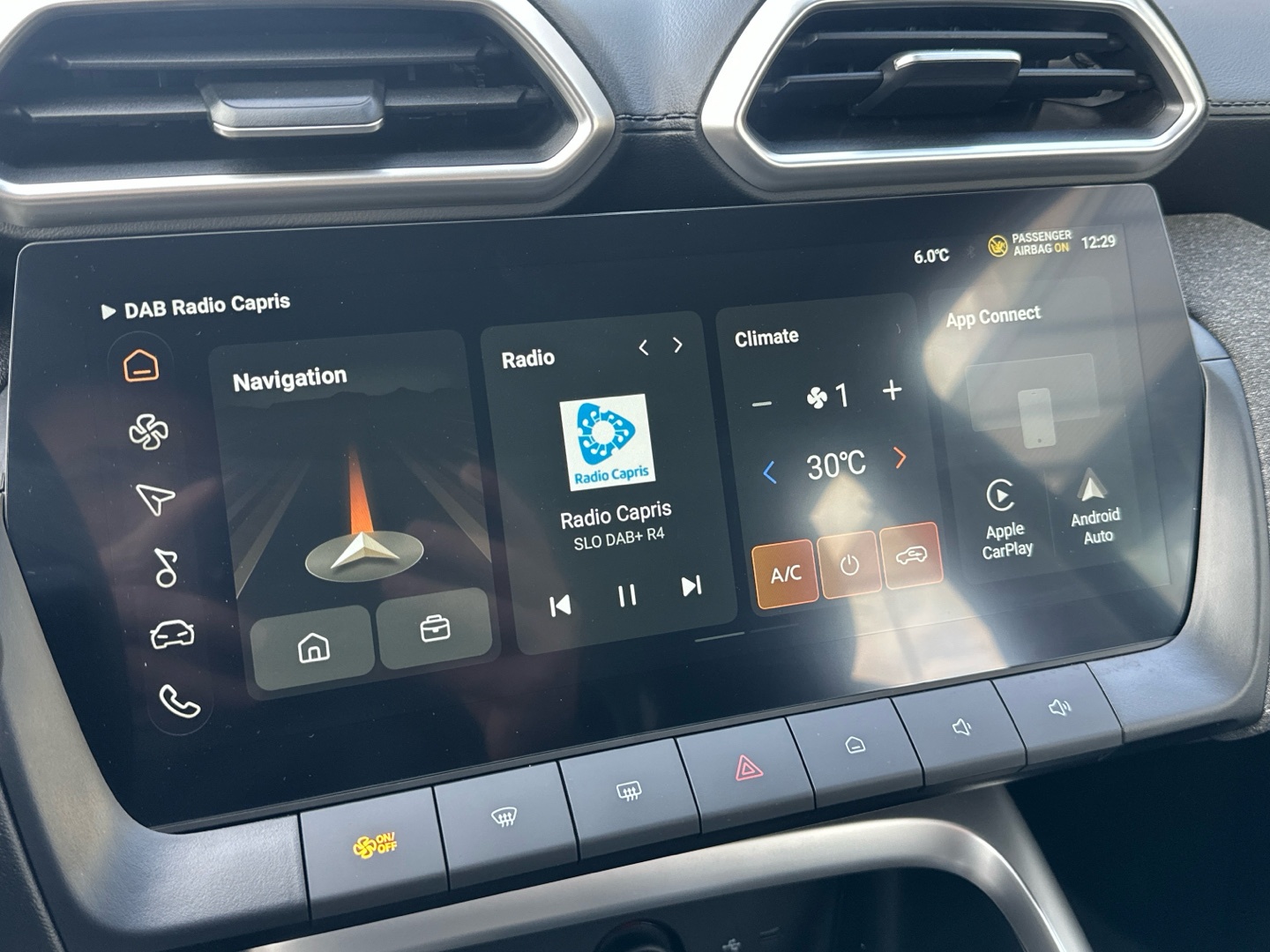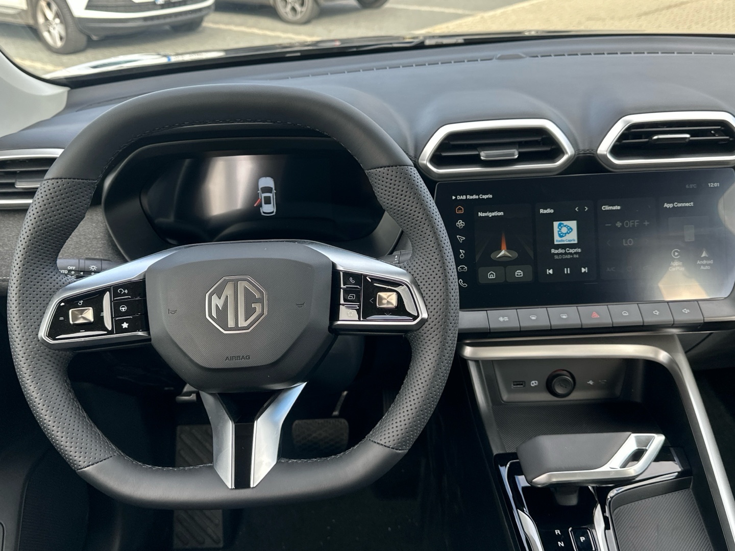 - Autorádio s dotykovým displejem 12″ s USB, DAB a Bluetooth HandsFree, zrcadlení telefonu (Apple CarPlay, Android Auto)