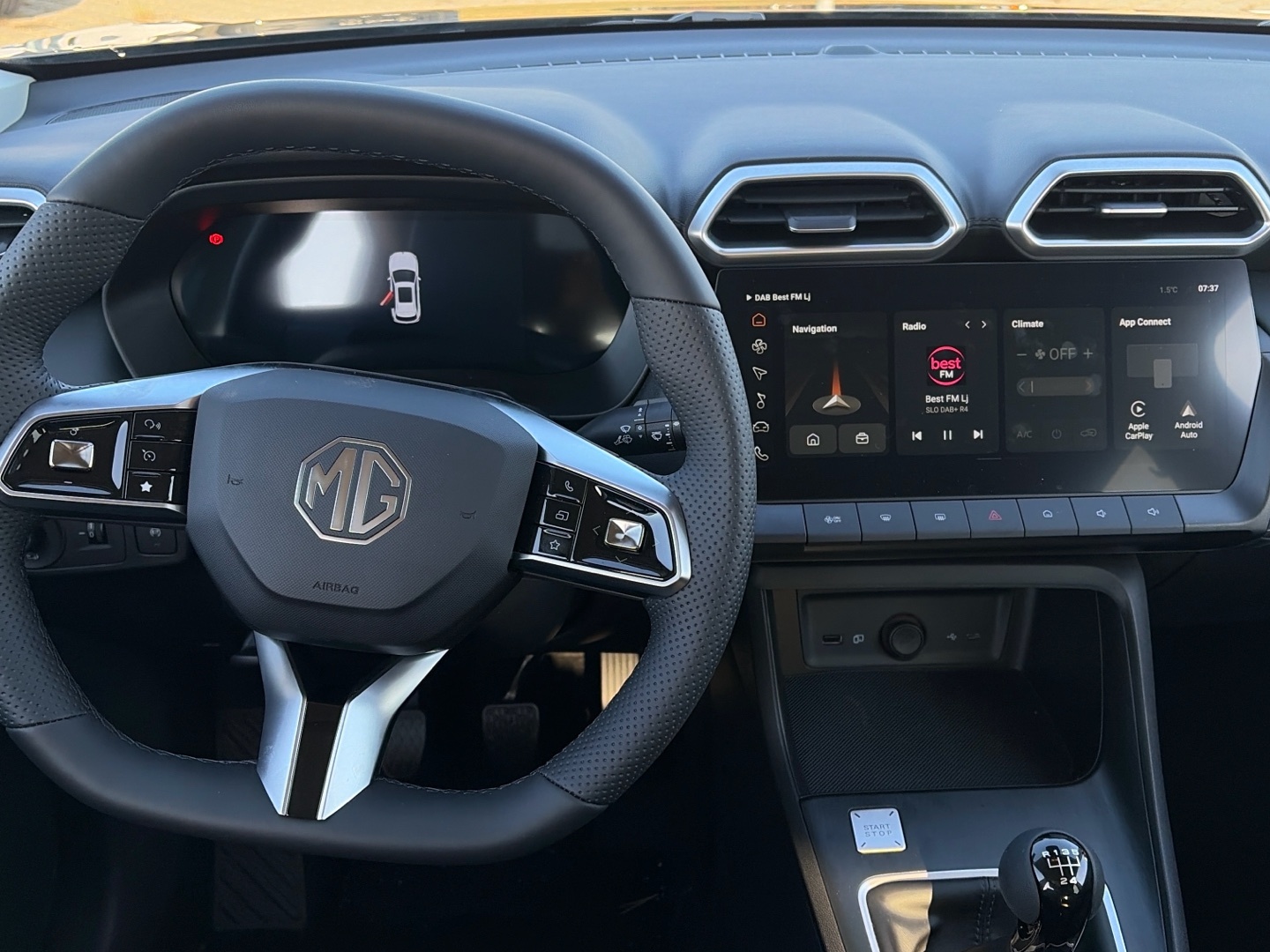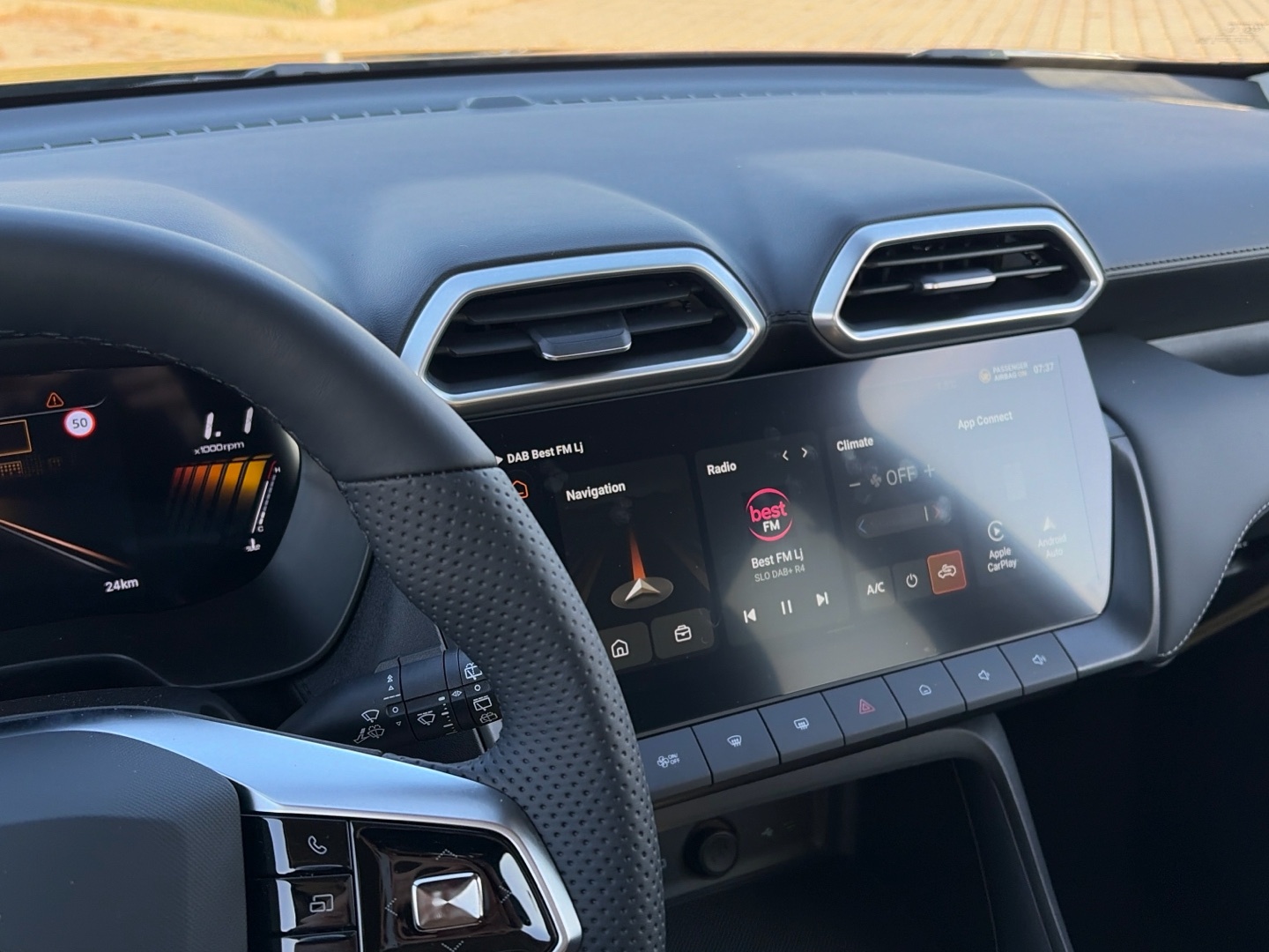 - Autorádio s dotykovým displejem 12″ s USB, DAB a Bluetooth HandsFree, zrcadlení telefonu (Apple CarPlay, Android Auto)